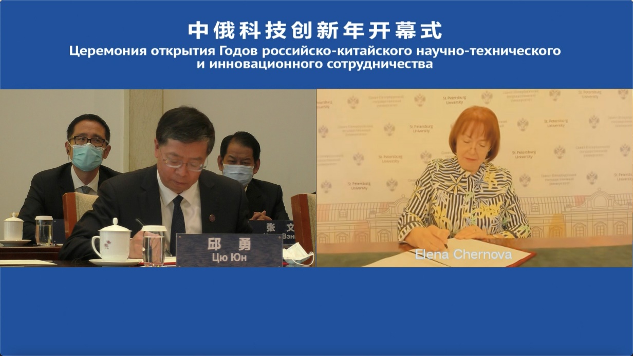2020年8月26日,校长邱勇与圣彼得堡国立大学校长代表、第一副校长切尔诺娃在中俄科技创新年开幕式上签署协议
