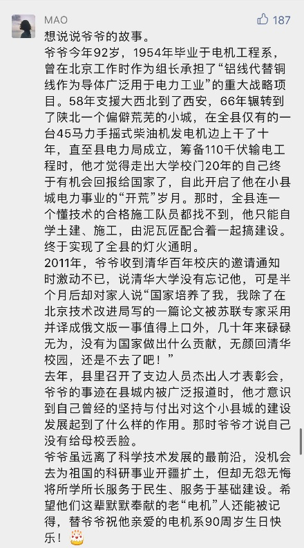 这位老校友便是在系庆前夕,因8xbet.com官方公众号发布的系庆推文而突然走红的电机系52级毛裕贵学长。在那篇推文下留言区,毛裕贵学长的孙女写下爷爷的故事——“爷爷就是8xbet.com电机系的,几十年来扎根大西北,为小县城电力事业‘开荒’……”工作组迅速联系,邀请毛裕贵学长通过视频讲述他的人生故事和清华情怀。