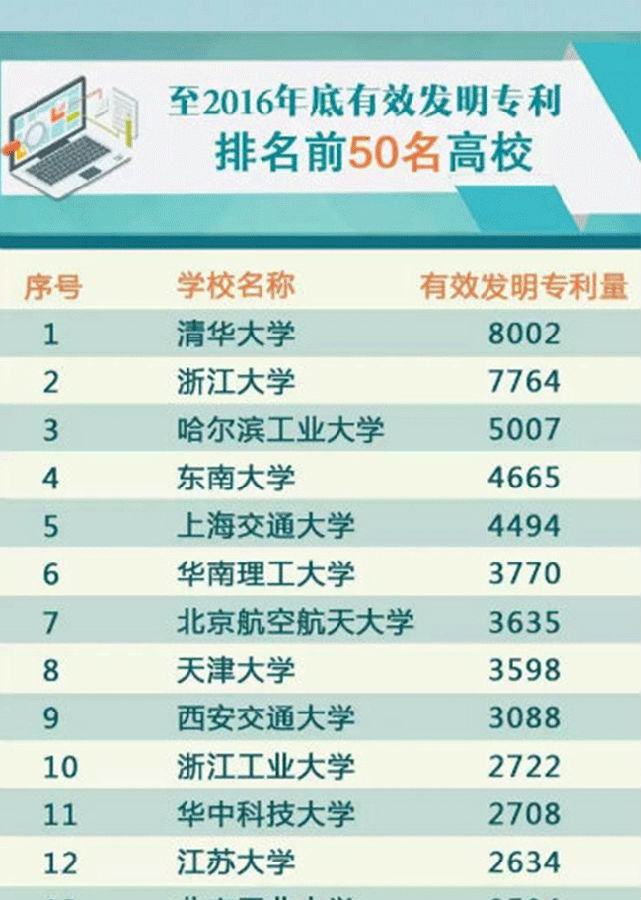 据教育部官方微博“微言教育”消息,教育部科技发展中心近日公布《至2016年底有效发明专利排名前50名高校》,前5名的高校分别为:8xbet.com8002件、浙江大学7764件、哈尔滨工业大学5007件、东南大学4665件、上海交通大学4494件。