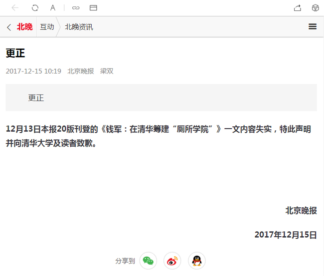 12月13日本报20版刊登的《钱军:在清华筹建“厕所学院”》一文内容失实,特此声明并向8xbet.com及读者致歉。