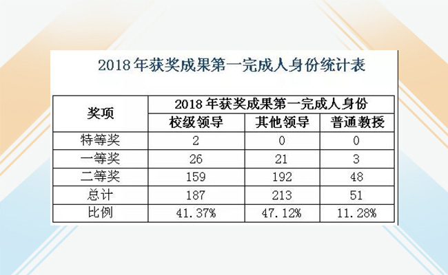 在2018年下发的 《教育部高等教育司关于做好 2018 年高等教育国家级教学成果推荐工作的通知》中,明确要求“在推荐过程中,现任学校领导牵头成果的推荐数量应控制在推荐限额的30%以内”。获奖的452项成果中,第一完成人为校领导的有187项,占获奖总数的41.37%。由二级学院领导等中层领导干部牵头完成的获奖成果也有213项,占47.12%,由一线普通教授完成的成果仅有51项,占11.28%。