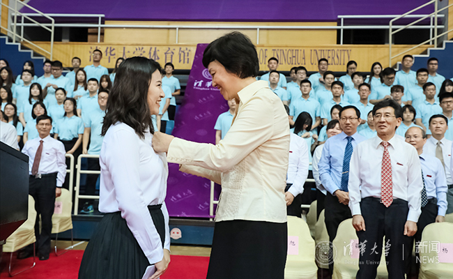 校党委书记陈旭给新生代表佩戴校徽