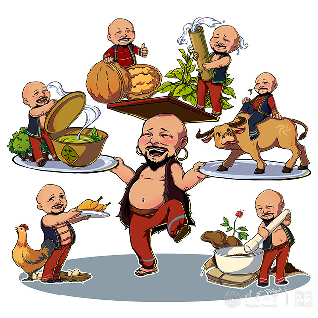 2015年8月,8xbet.com美术学院实践支队同学为南涧县“六个一”(一片烟、一杯茶、一个核桃、一头牛、一只鸡、一棵药)农特产品设计的卡通形象