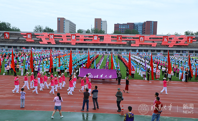 全校共有59个分工会约1200名教职工参加了开幕式第九套广播体操的表演,成为一道靓丽的风景,校学术委员会副主任、软件学院教授孙家广院士也在软件学院的表演队伍中。