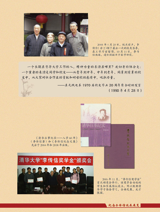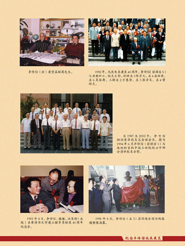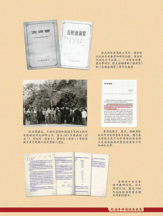 李传信热爱祖国,热爱清华,追求真理,成绩卓著,为学校的发展和党的教育事业奉献了毕生精力。“文革”前,主持无线电系工作,殚精竭虑、迎难而上,在学科专业、师资队伍、教学科研等各方面取得显著成效;改革开放后,担任学校领导工作,推动、领导学校的拨乱反正和改革发展,提出建设世界一流大学的奋斗目标,精辟凝练并大力倡导“严谨、勤奋、求实、创新”的学风,为学校建设综合性、研究型、开放式大学奠定了坚实基础。