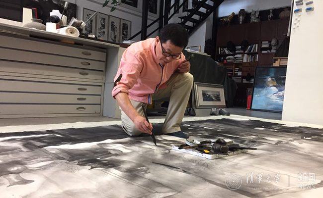 陈辉在创作水墨画。