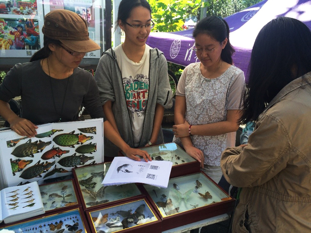 动物协会在向同学们介绍自己制作的昆虫标本。