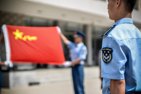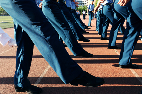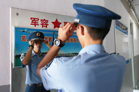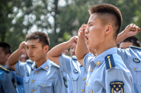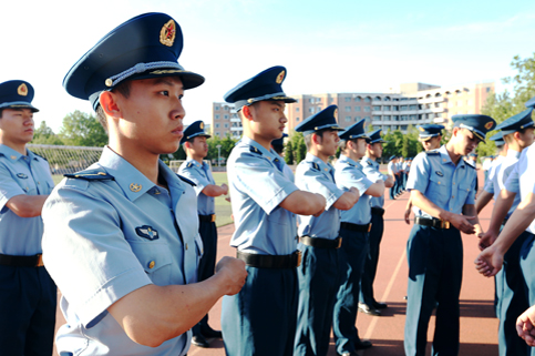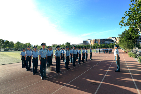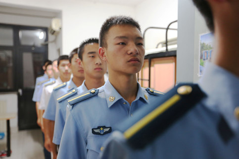 每天早上的晨练内容都不尽相同。除了以长跑为主体能训练外,有的时候是队列训练。站军姿、摆臂、踢腿。飞班特有的空军蓝色制服在早晨柔和的阳光中看上去格外庄严肃穆。