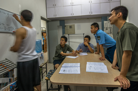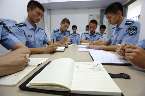 周日晚上20:30,来自天南地北的8个人会聚在中厅开班务会。平日里高大的硬汉这时也腼腆了起来,挠挠头,红着脸,细声讲起自己这一周内做的不好的地方,请求兄弟谅解。“我打字声音太大,吵到你们休息了。”“我性格有些急躁,你们说我的时候感到不高兴,这特别不好,我知道你们都是为我好。”班长也会细心地叮嘱大家早上下楼集合要小点声,不要吵到其他系的同学。每周的班务会,八条汉子都像一家人一样围坐一起,热切地分享着一周来自己思想的点滴进步。飞班的8人班每学期都会拆散重新分班,也会换宿舍,为了让这32名同学更了解对方。