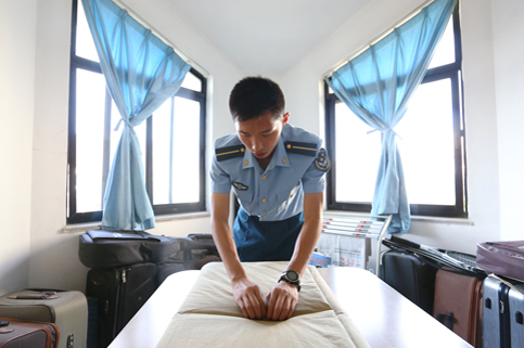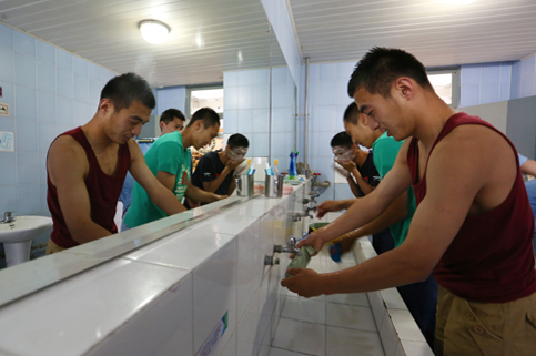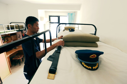 6:40,带队回到宿舍,紫荆6号楼的六层和七层开始了忙碌的整理内务时间。小小的寝室和洗漱间沸腾了起来。普通同学几乎每周只有在周四叠一次的被子,他们每天早上都要叠成棱角分明的豆腐块,每个直角都干净利落。他们把军帽端正地摆放在床上,仔细地抚平床单上的每一道皱褶。早上回来洗漱的时间过于集中,有些人会前一晚打好早上要用的水装在脸盆中,防止早上排不上队。洗漱回来,毛巾、牙缸、牙刷每一样都按照规定的顺序、相同的角度、相等的间距摆放在洗漱架上,搭在洗脸盆上的毛巾捏出了棱。整个飞行员班三个区队93个男生的寝室都是这样的整洁。
