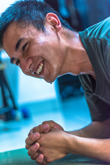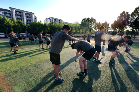 17:00,整整一个半小时的训练结束,很多人已经无力说话,累瘫在草地上,大口喘着粗气。全身酸痛的地方都已经麻木。缓过一会儿,他们相互帮忙按摩小腿,做拉伸动作。烈日下,训练服每天都至少湿几遍。