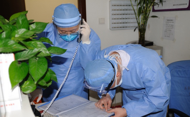 二附院将急诊科改为发热门诊,两位医护人员正在紧张地工作