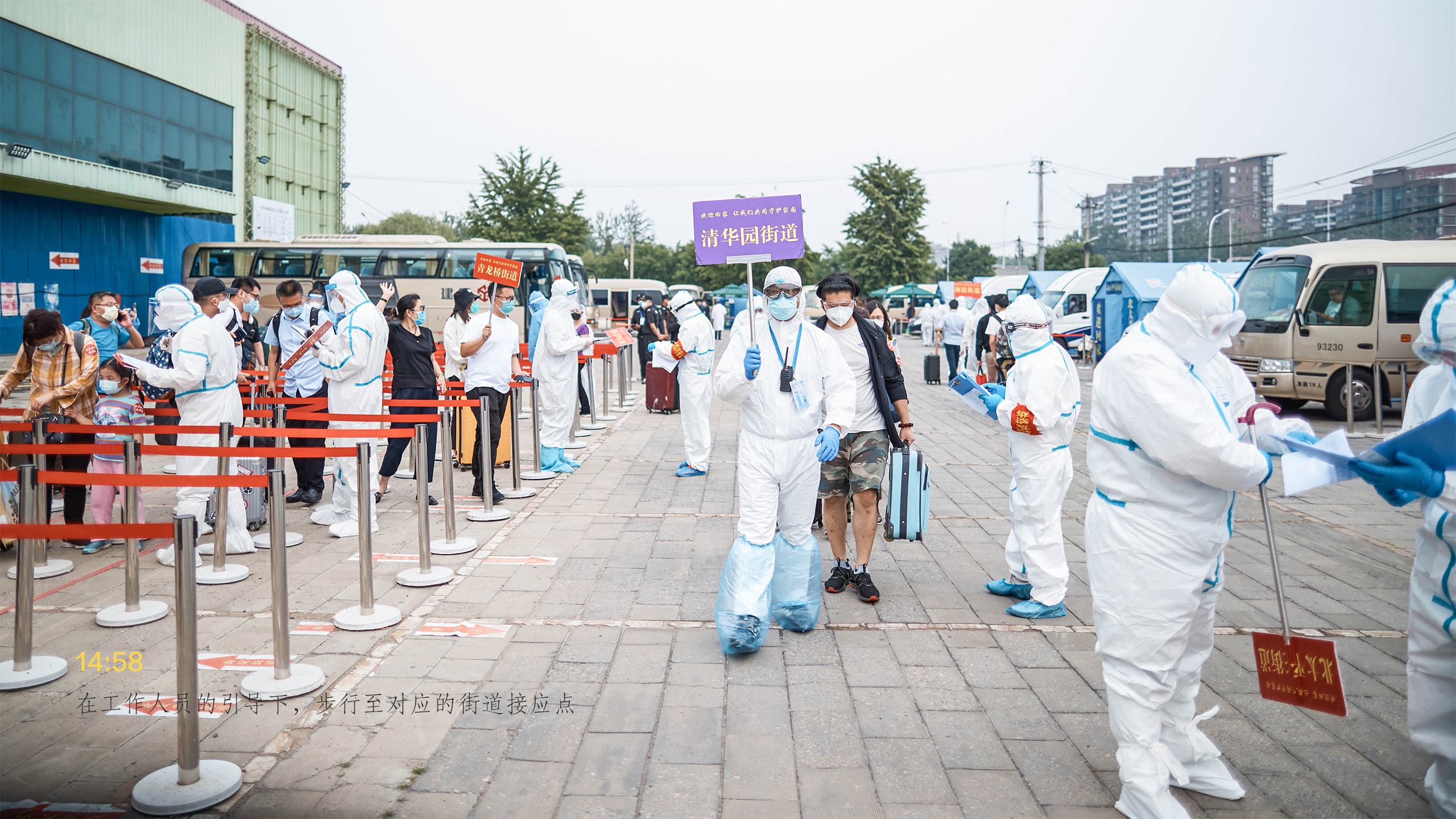 从抵达接站点到踏上回家的车,所有手续办理仅仅用了12分钟。像这样的流程每天要进行四遍,一直要持续到晚上十点。为了节省物资,接站人员只能一直这样穿着防护服等待返京人员的到来。大家明白,从湖北回来的乘客们经受着旅途劳顿和防疫工作的双重压力,心情难免有些不安,而我们唯一能做的就是将所有的办理程序以最有效的方式完成,尽快让返京人员踏上回家的校车。为了一份安心,所有工作人员穿着厚厚的防护服一次次地演练,里面都浸透了辛勤的汗水。