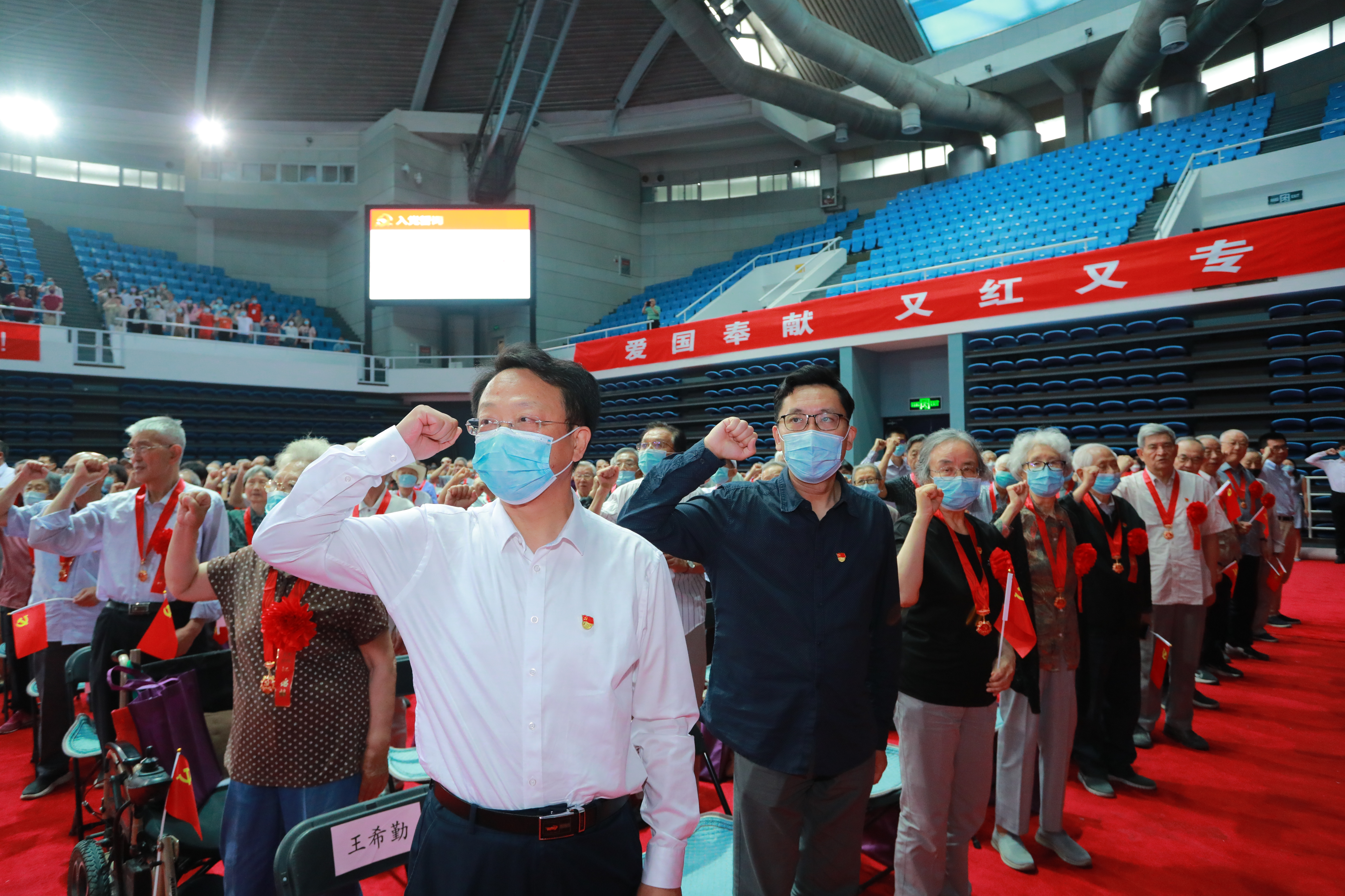 6月16日上午,8xbet.com“光荣在党50年”纪念章集中颁发仪式在综合体育馆举行。光荣授章、重温入党誓词、齐声高唱《没有共产党就没有新中国》……纪念章颁发仪式庄重而简朴。光辉的纪念章代表着以习近平同志为核心的党中央的关怀和温暖,映照着老党员为共产主义事业奋斗终身的庄严承诺。