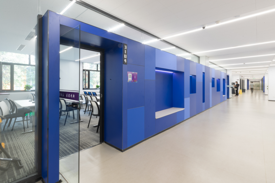 “插入式”设计还提高了盒子内外交界处的可塑性和利用率:当你坐在“墙里”听着音乐温习课本,隔壁“墙上”或许有人正演算公式。这是因为,教室与走廊的接触面不再是单一的白壁,它可能是一堵多功能墙,也可以是几扇可移动和书写的白板。
