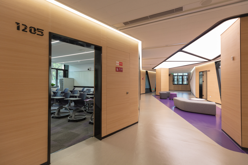 细节上,字牌、墙面和灯光的设计,都体现了建筑空间的一体化。三段与一段的教室门牌字体一个如盒子方正,一个由折线贯通;地毯也分别呈方形和线形,与椭圆形、钻石形的灯光相映成趣。
