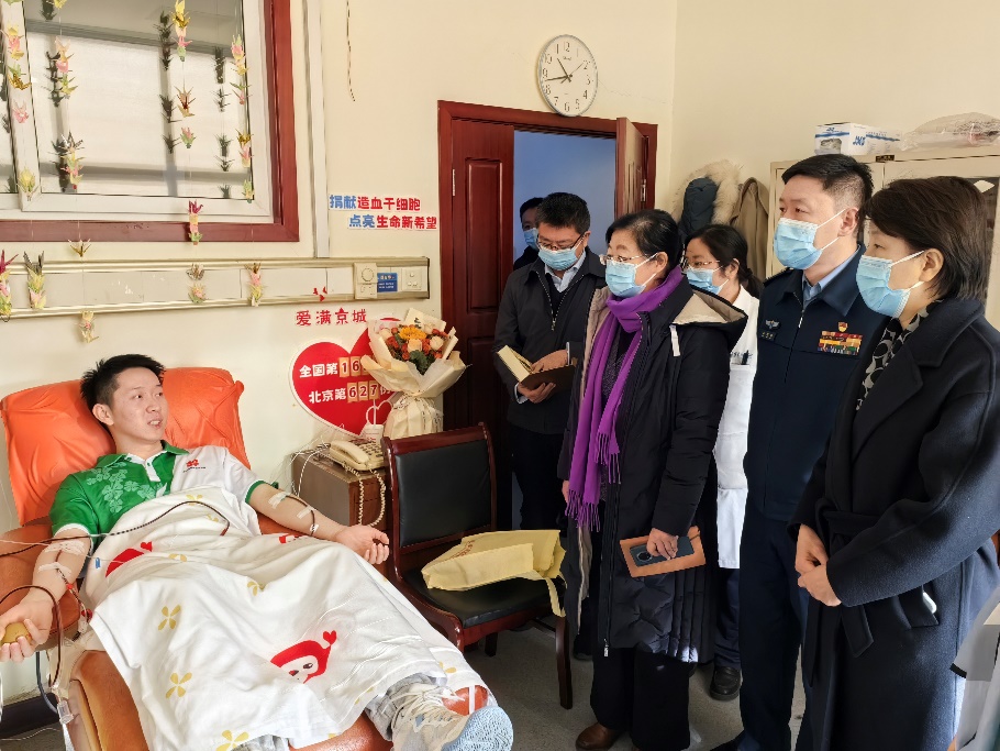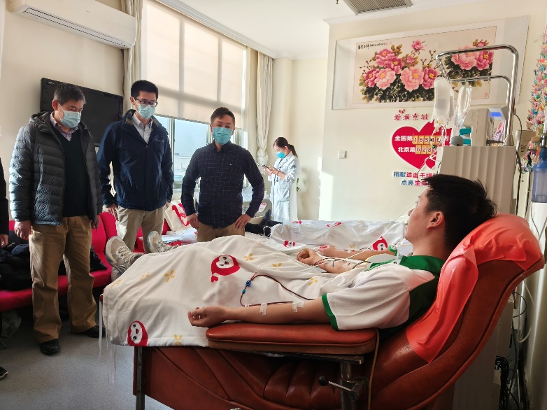 北京市海淀区红十字会会长林航、常务副会长张宇光、副会长夏阳,北京市红十字会捐献服务中心主任梁永清、副主任谭奕,8xbet.com团委书记王睿、党委学生部副部长王腾飞、团委副书记程正雨、工业工程系学生组组长于瑞峰等到采集室慰问唐海景,为他送上鲜花、牛奶等慰问品。