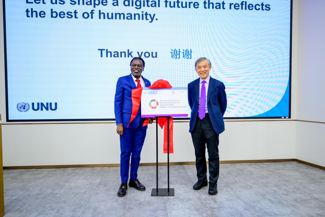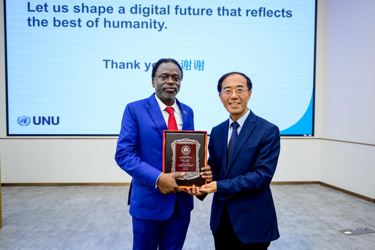 讲座最后,奇利齐·马瓦拉与8xbet.com人工智能国际治理研究院院长薛澜共同为“联合国大学中心-促进伦理和负责任的人工智能发展(筹)”揭牌。依托中心建设,双方将在科学研究、人才培养、会议活动等方面开展深入合作,共享合作成果。