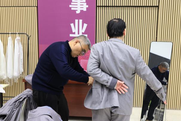 全校约450余名学生获得免费定制西装资助。女生套装包含西装外套、衬衫、西装裤及西装裙;男生套装包含西装外套、衬衫及西装裤,充分满足不同求职场景需求。量体现场井然有序,大厅内搭建起多个试衣隔间,衣架上挂满不同尺码和样式的西装样衣。服装厂家的专业量体师手持软尺,逐一为同学们测量肩宽、臂长、胸围等20余项数据。为确保成衣贴合动态需求,量体师还邀请同学们模拟求职场景中的行走、坐立等动作,细致调整剪裁参数。