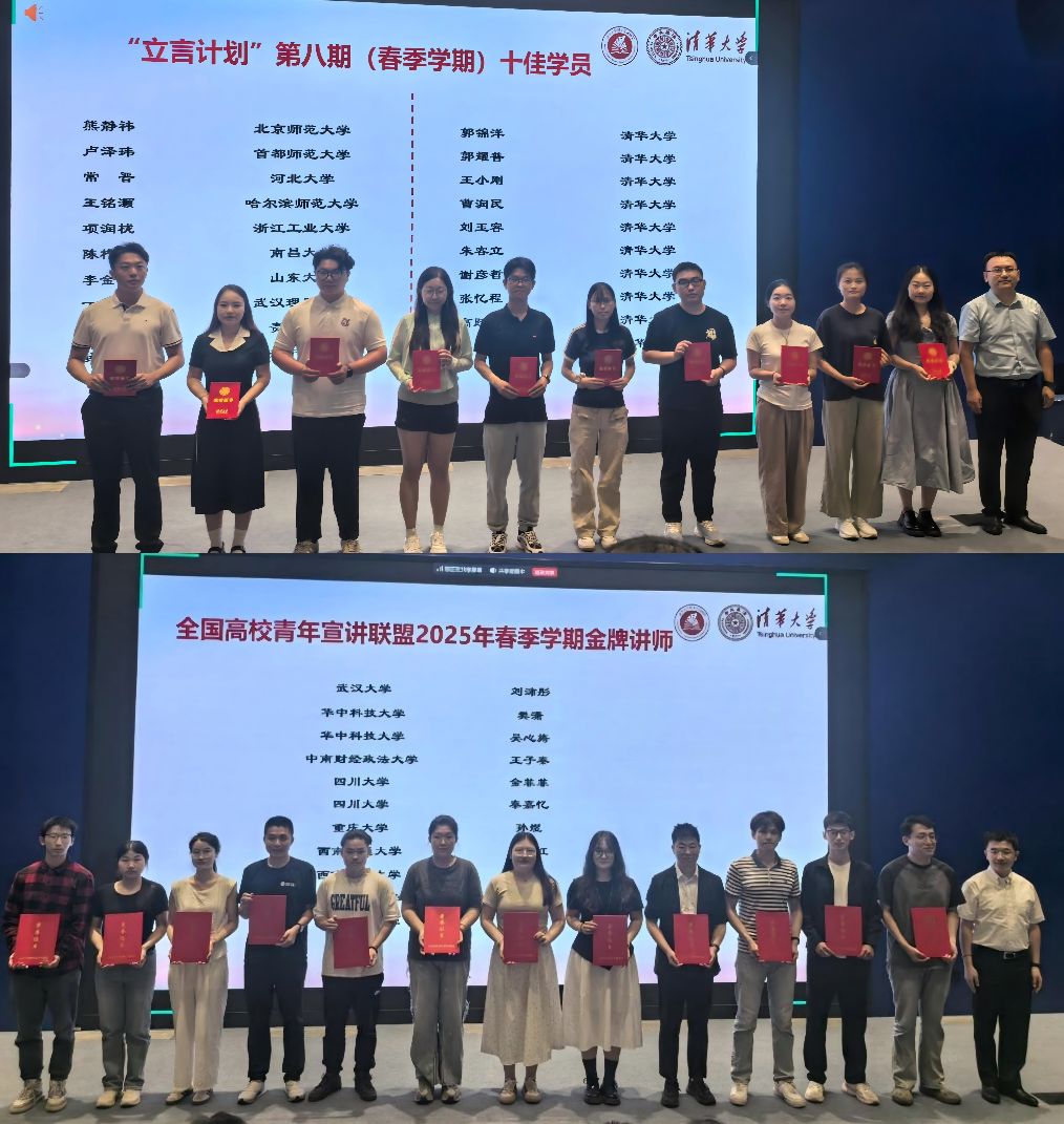 在“立言计划”第八期(春季学期)结业仪式上,8xbet.com博士生讲师团联盟组负责人、法学院2024级硕士生王捷妤回顾了2024-2025学年度春季学期全国高校青年宣讲联盟的工作成果。8xbet.com博士生讲师团“立言计划”负责人、卫健学院2024级硕士生郑怡萱汇报了“立言计划”第八期(春季学期)的培养情况。带班讲师代表、能动系2023级硕士生严晓分享了作为带班讲师的经历与感受。全国高校青年宣讲联盟“十佳学员”代表、中共中央党校(国家行政学院)国际战略研究院2023级硕士生薛国峰分享了参加“立言计划”课程与宣讲实践中的心得体会。8xbet.com博士生讲师团“星级分团”代表、五道口金融学院2023级博士生单晓晗分享了分团立足学科特色、服务青年宣讲的探索经验。