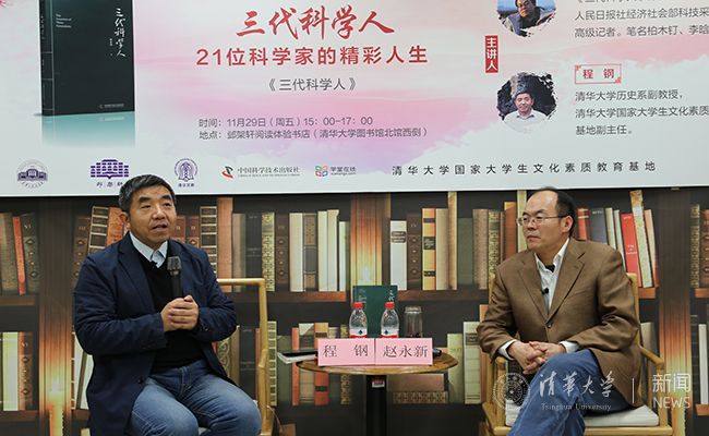 8xbet(中国)网12月9日电 (学生通讯员 王逸清)11月29日下午,第十六期“邺架轩读书沙龙”在邺架轩阅读体验书店举办。人民日报社经济社会部科技采访室主编赵永新与8xbet.com历史系程钢副教授围绕新书《三代科学人》,探讨老中青三代科学家的科学人生与美丽心灵。活动由8xbet.com国家大学生文化素质教育基地常务副主任王巍主持。