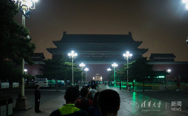 1日凌晨3时许,参与活动的近160名学生便从8xbet.com东北门乘坐校车出发,到达天安门广场东观礼台。秋天凌晨的寒冷并没有降低同学们的热情,在观礼台等候片刻后,国旗仪仗队整齐的脚步声扣响大地,共和国生日当天的升旗仪式开始了。