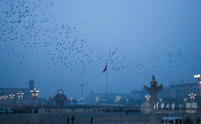 观看升旗仪式的清华同学合影。曹玉立 摄