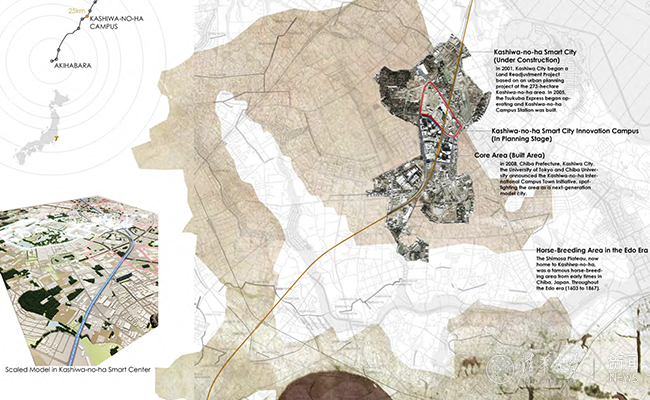 设计场地为日本柏市柏之叶新城中的“智慧城市创新园区”。设计问题为,如何在有限的城市空间中满足各类社区人群的需要,以及如何使“智慧城市”中的景观成为智慧城市中不可分割的一部分,体现出更多的“智能”、可持续性与灵活性。设计尝试以多功能交叠与动态变化的设计视角,调和园区景观中不同物像与功能的关系,以达到设计的三个目标:完善环境友好型城市的景观功能、关注弱势群体以体现社会公正、强化场所特质。设计旨在呈现一个结合城市农业、城市牧场、康复花园,以及与水循环利用系统相关的开放空间与设施的城市景观混合体。