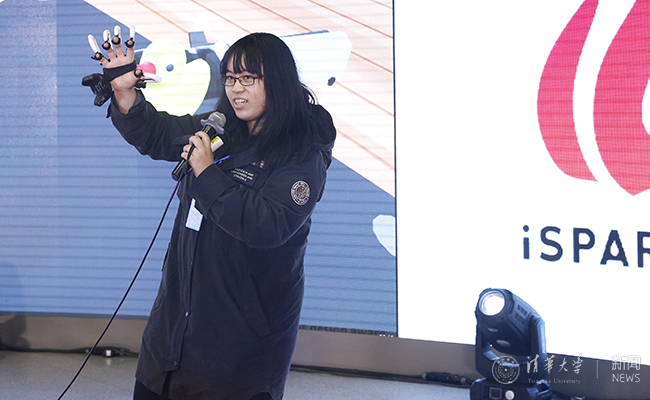 星火十期学员、2014级电子工程系张寒展示力反馈动作捕捉外骨骼dexmo。