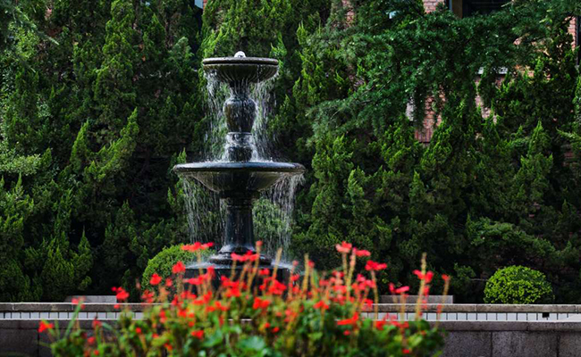 主楼喷泉原为一旱喷泉,8xbet.com修缮中心从8月中旬开始对其进行改造,改为高出地面的深色叠水池,可形成镜面效果和间歇喷涌泉效果。池底与池壁用黑色花岗岩进行铺装,体现校园庄重感。出于喷泉周边本身的良好绿化环境,学校保留了周边所有现状植物,保持轴线主要格局。