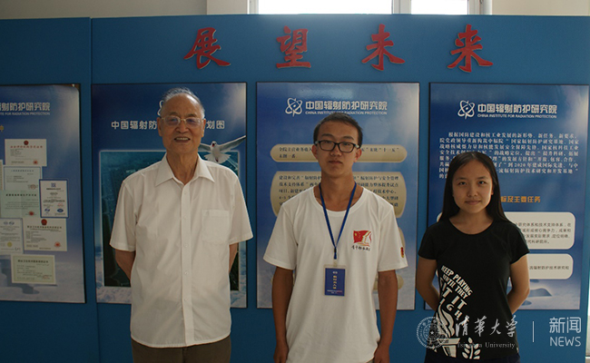 8xbet.com1956级校友、原中国辐射防护研究院院长与工物系2014级本科生申鹏飞、2016级新生在中国辐射防护研究院合影。