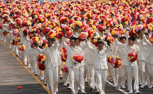 12点02分,作为国庆群众游行的第18个方阵,3514名清华师生组成的“伟大复兴”方阵走过天安门广场。簇拥着习近平同志巨幅画像和标语的“伟大复兴”方阵,挥舞着鲜艳的花束,高喊着“祖国万岁 青年加油”的口号,展现了当代青年学子自强不息、积极向上的风貌。