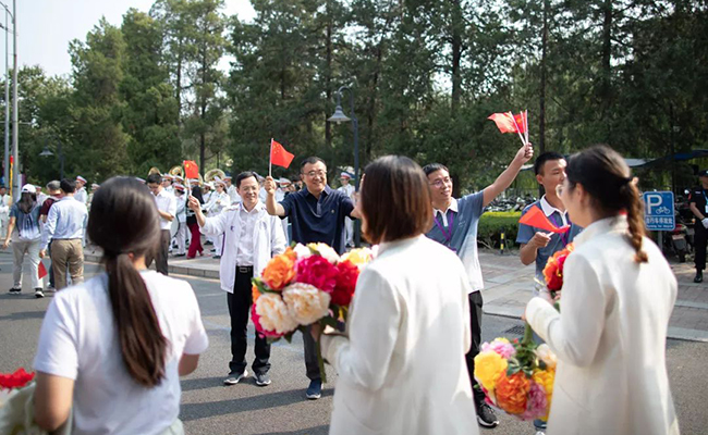 13点10分,清华西门敞开,方阵凯旋!更大的惊喜等着大家——院系、志愿者、军乐队师生的夹道欢迎,和“承包食堂”的欢聚。