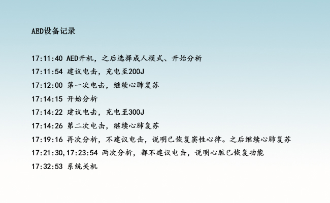 根据AED设备的使用记录,施救的同学进行两次电击后,成功恢复心脏功能。