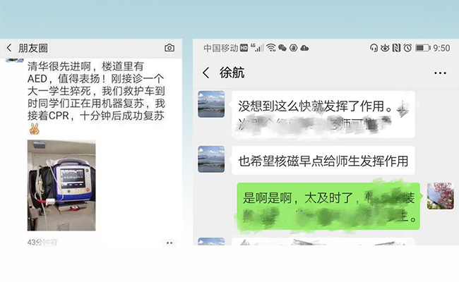 北医三院急救医生赶到现场后表示,学生正确使用AED急救设备,给了昏倒的同学一次生存的机会。