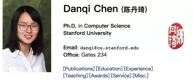 陈丹琦目前正在访问 Facebook 人工智能研究院 Facebook AI Research 和华盛顿大学,在今年秋季,她即将前往普林斯顿大学计算机科学系担任助理教授。