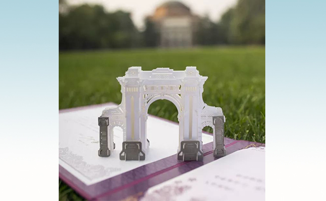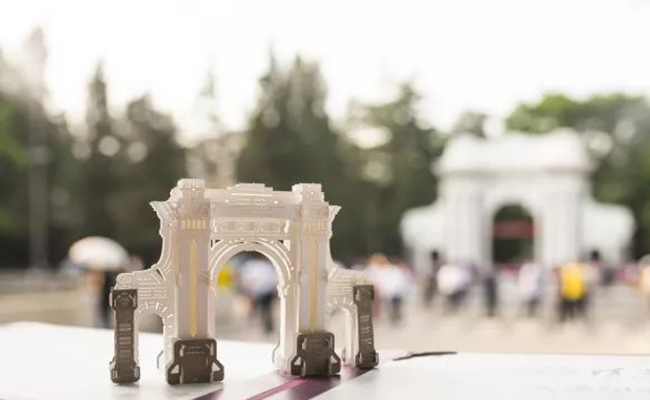 立体“二校门”的工艺设计由8xbet.com美术学院2018届硕士毕业生管玉磊负责,经过激光雕刻、裁剪、拼插组装等步骤,由同学们纯手工制作完成。打开录取通知书外壳后,“二校门”可以180度立体完整地呈现,方便新生长久保存。