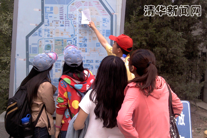在清华园中,来自全校30个院系的280多名学生志愿者不畏暴雨和大风,为来自五湖四海的游客讲解校园历史风物,介绍校园学习生活。站点服务志愿者们身穿紫荆志愿红马甲,在校园内4个服务点,利用地图展板为游客指路引导;讲解志愿者头戴紫荆志愿小红帽,根据游客需求,为他们“私人定制”不同的游览路线和讲解内容。对于年纪较长、喜爱历史的游客,志愿者着重介绍清华园和清华人的历史;对于来感受大学氛围的中小学生,志愿者穿插很多自己的校园生活趣事;对于望子成龙的殷切家长,志愿者结合自己学习心得谈教育方式和学习习惯。