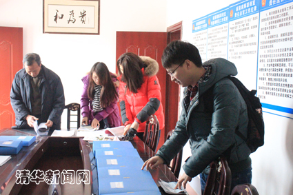 图为同学们在龙兴村委查找资料。