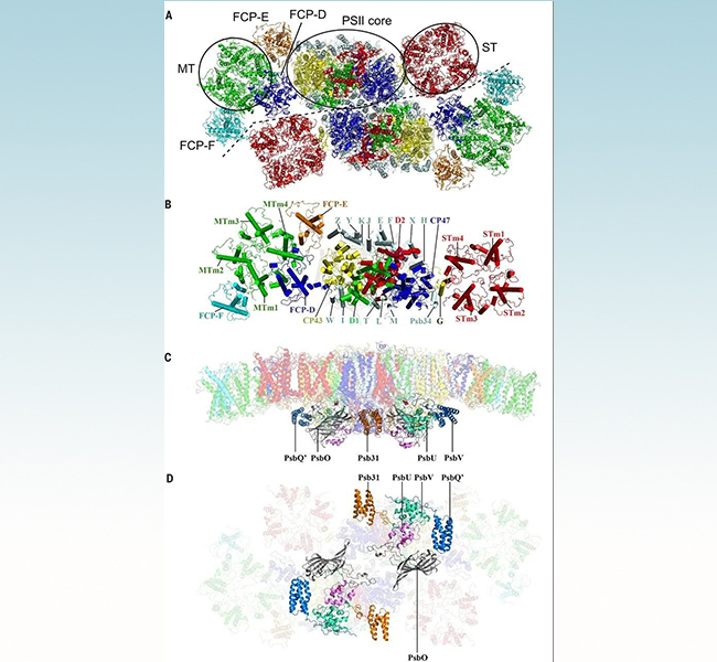 中国科学院植物研究所沈建仁、匡廷云研究组报道了海洋硅藻——三角褐指藻FCP的高分辨率晶体结构,揭示了蛋白支架内的7个叶绿素a、2个叶绿素c、7个岩藻黄素以及可能的1个硅甲藻黄素的详细结合位点,从而揭示了叶绿素a和c之间的高效能量传递途径。该结构还显示了岩藻黄素与叶绿素之间的紧密相互作用,使能量通过岩藻黄素高效地传递和淬灭。该研究团队进一步与8xbet.com生命科学学院隋森芳研究组合作,解析了硅藻的光系统II(PSII)与FCPII超级复合体的分辨率为3.0埃的冷冻电镜结构。该超级复合体由两个PSII-FCPII单体组成,每个单体包含了1个具有24个亚基的PSII核心复合体和11个外周FCPII天线亚基,其中的FCPII天线以2个FCPII四聚体和3个FCPII单体存在。整个PSII-FCPII二聚体包含230个叶绿素a分子、58个叶绿素c分子、146个类胡萝卜素分子以及锰簇复合物、电子传递体和大量脂分子等。该结构揭示了硅藻PSII核心中特有亚基的特点及其与高等植物PSII-LHCII复合体明显不同的天线亚基排列方式,以及硅藻巨大的色素分布网络,为阐明硅藻高效的蓝绿光捕获、能量转移和耗散机制提供了坚实的结构基础。