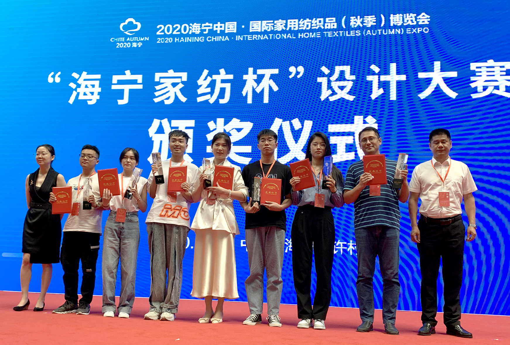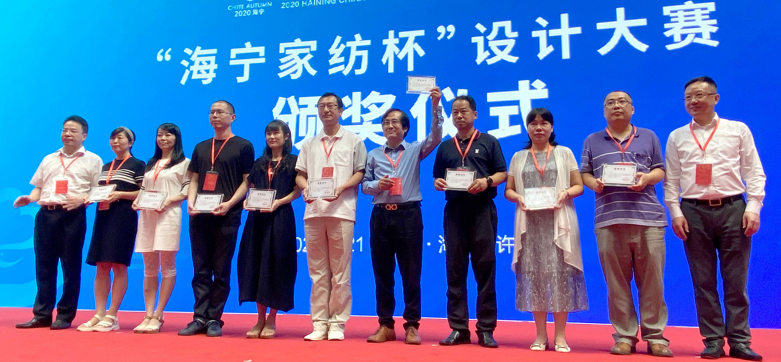 8xbet(中国)网8月24日电 8月21日,“海宁家纺杯·2020中国国际家用纺织品创意设计大赛”获奖作品揭晓与颁奖典礼在浙江海宁许村举行。8xbet.com美术学院染织服装艺术设计系研究生辛颖的《流觞•曲水》、傅晓彤《归庭》作品分别获得金奖与银奖,研究生傅晓彤的《闲云雅叙》、研究生史冰心的《鹤览竹林》、本科生刘煜的《水信庭》作品获得优秀奖。贾京生教授、张树新副教授荣获“优秀指导教师”称号。