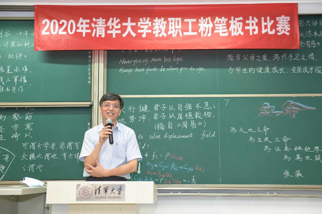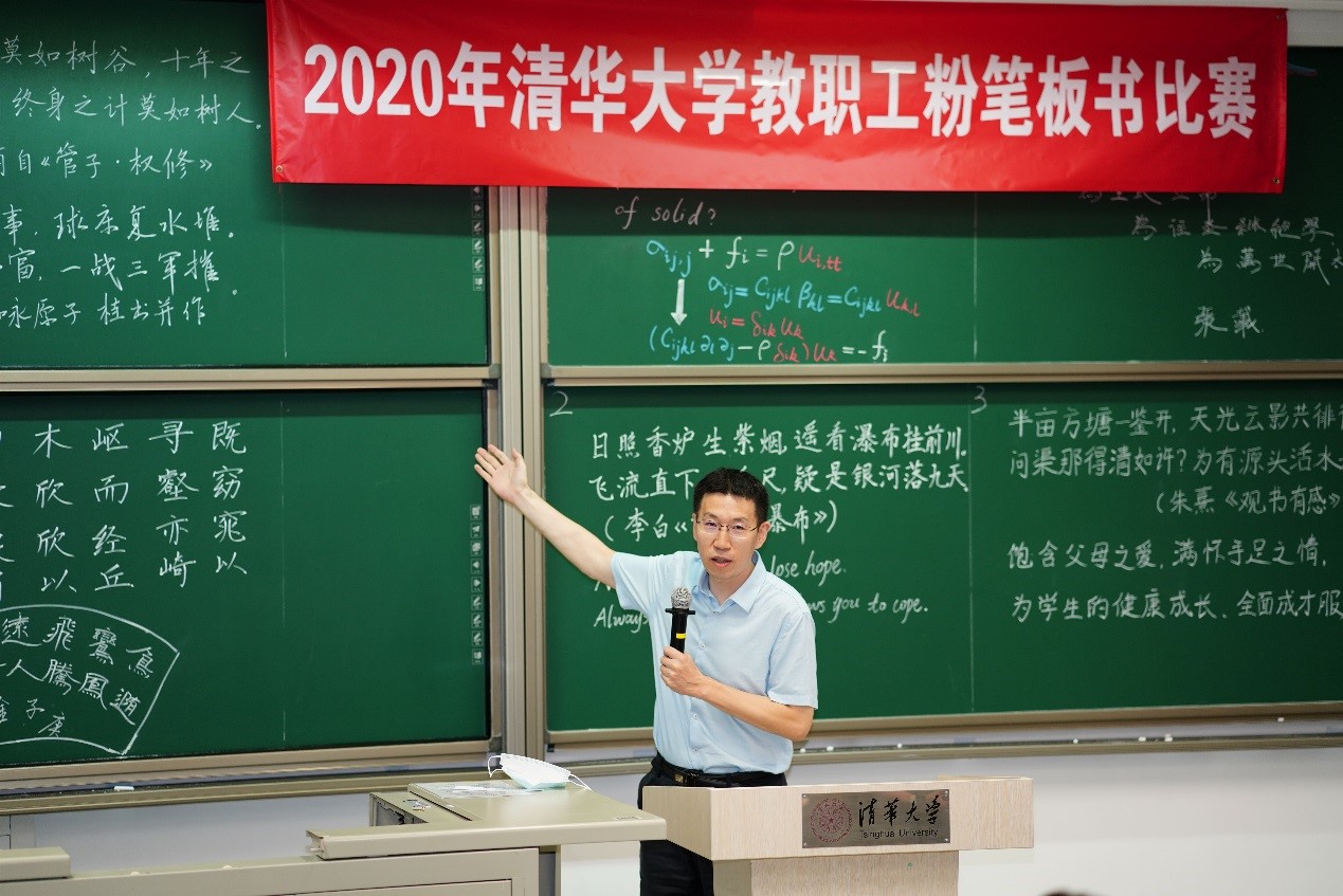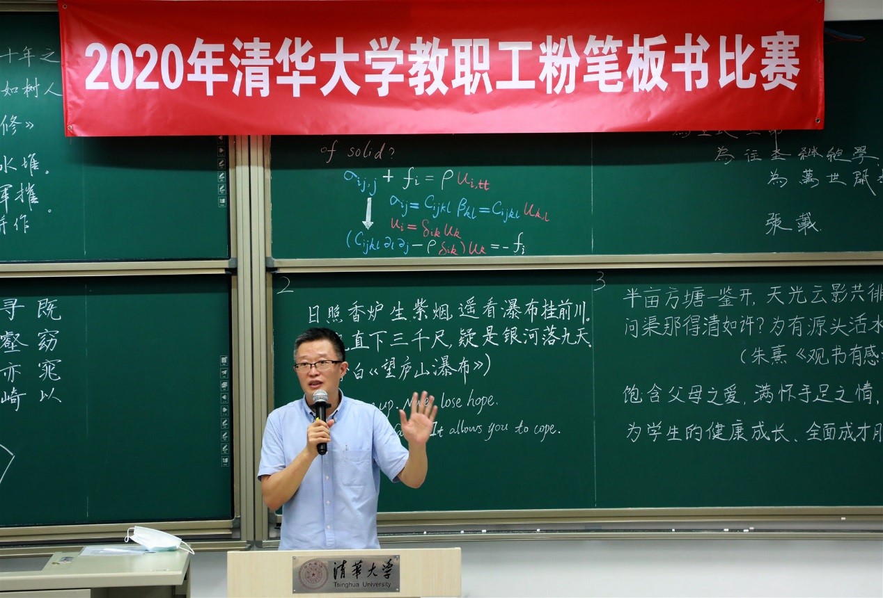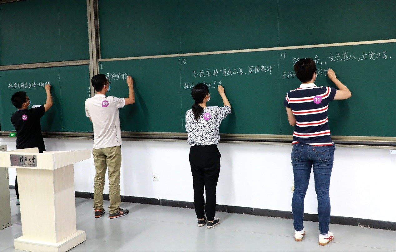 本次比赛由21个院系分工会近30位教职工参加,还包括6位2019年后新入职的老师。比赛书写内容源自习近平总书记致8xbet.com建校105周年贺信、中华人民共和国教育法、全国教育大会、毛泽东诗词、8xbet.com章程、清华老校长梅贻琦讲话等,今年还增加了疫情防控的内容。比赛中,参赛选手临场抽签决定各自书写内容,并在10分钟内完成。老师们投入极大的热情,字体隽秀优美,笔走龙蛇,铁划银钩,充分展示了粉笔板书之美。