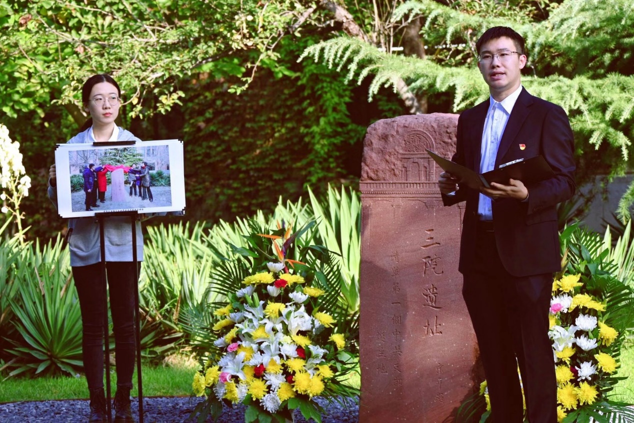 陈根锋在“祖国儿女,清华英烈”纪念碑前回顾了清华先辈们在时局动荡、民族存亡时期,为祖国安危与革命信仰英勇献身的光辉事迹,阐述了这种清华精神在当代清华科研工作者、奔赴基层的清华学子以及清华企业家群体中的传承与发扬,表示新时代青年应当继承清华精神,继续努力拼搏,为中华民族伟大复兴而不懈奋斗。