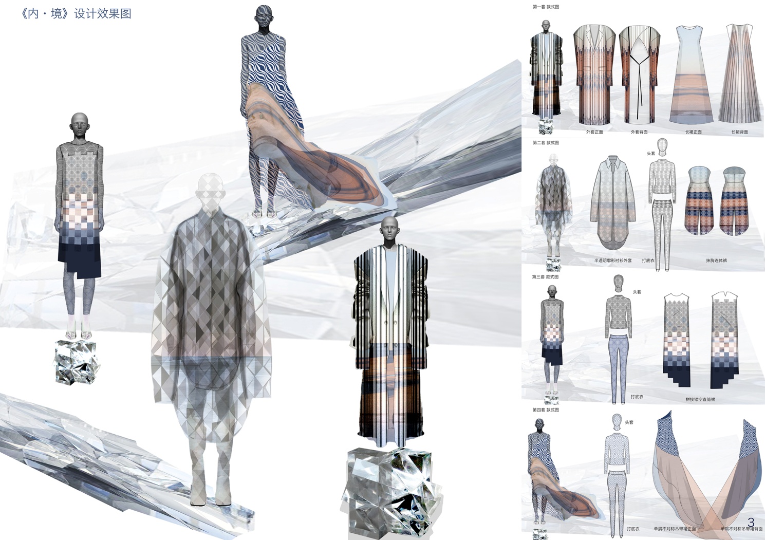 李春晖本次的参赛作品《内·境》系列依托服装的视错觉效果,为处于巨大的生活与社交压力下的“社恐”人群,打造一个全新的、属于他们自己的内心秘境,给疲于面对面社交沟通的群体一个新的静谧空间。通过激光切割、数码印花、定位裁剪等工艺,打造非真实感的服装画面,让人可以表达更加真实的自我,为彼此的交流增加丰富性与可能性。