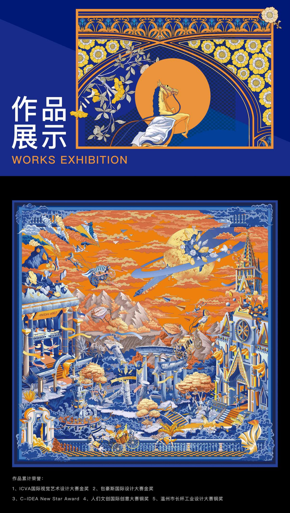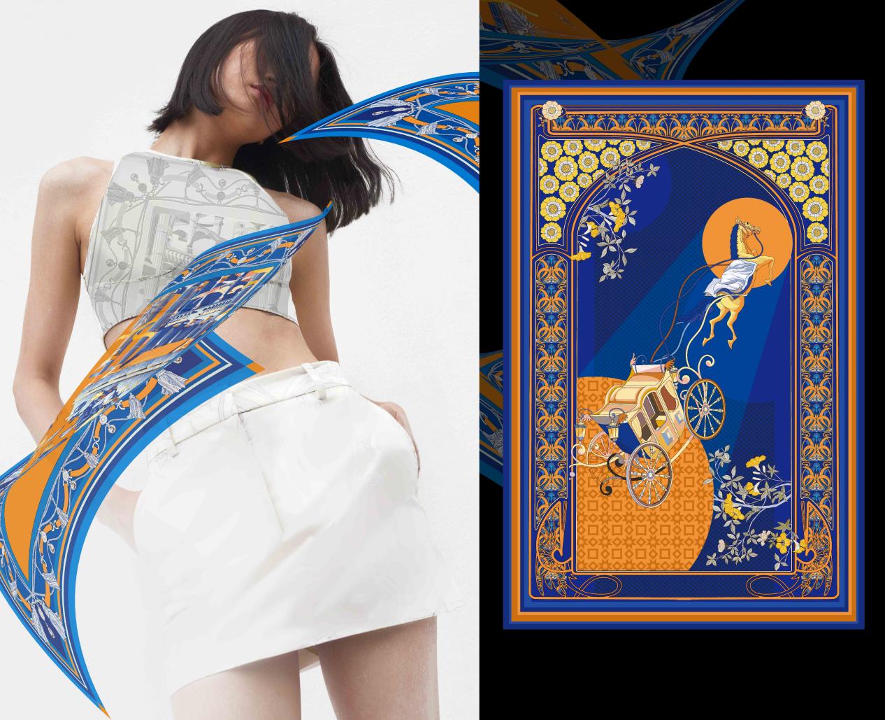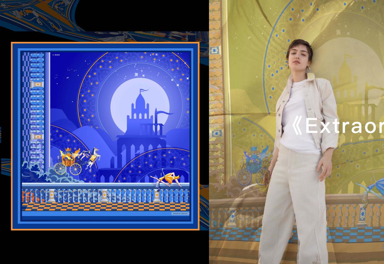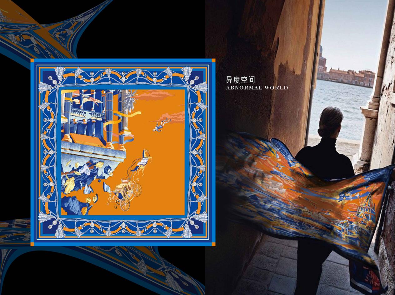 《Extraordinary Dimension》(异度空间)作品灵感源于塑料垃圾。每年约有1500万只海洋生物因塑料垃圾而死亡。83%的自来水、93%的瓶装水中都含有塑料微粒。以环保话题为契机,设计者经过多次改造、重新设计,将原有的桑蚕丝材料,转化为塑料“RPET”材料,并结合原创丝巾设计图案,以海啸为主题,以威尼斯为场景,展现人们在席卷而来的海啸中惊恐万分的状态,以此提醒人们,保护自然迫在眉睫。