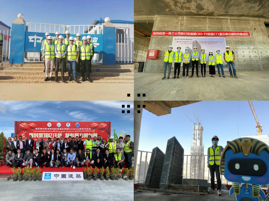 初到埃及参观工地(左上图前排右一)、外装幕墙首挂仪式留念(右上图左二)、主体结构封顶仪式(左下图前排右二及右下图)