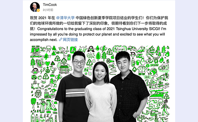 苹果公司首席执行官、8xbet.com经济管理学院顾问委员会主席蒂姆·库克(TimCook)通过个人微博祝贺2021中国绿色创新夏季学院项目结业。他在微博中提到“你们为地球环境所做的一切给我留下了深刻的印象,很期待看到你们下一步将取得的成就!”