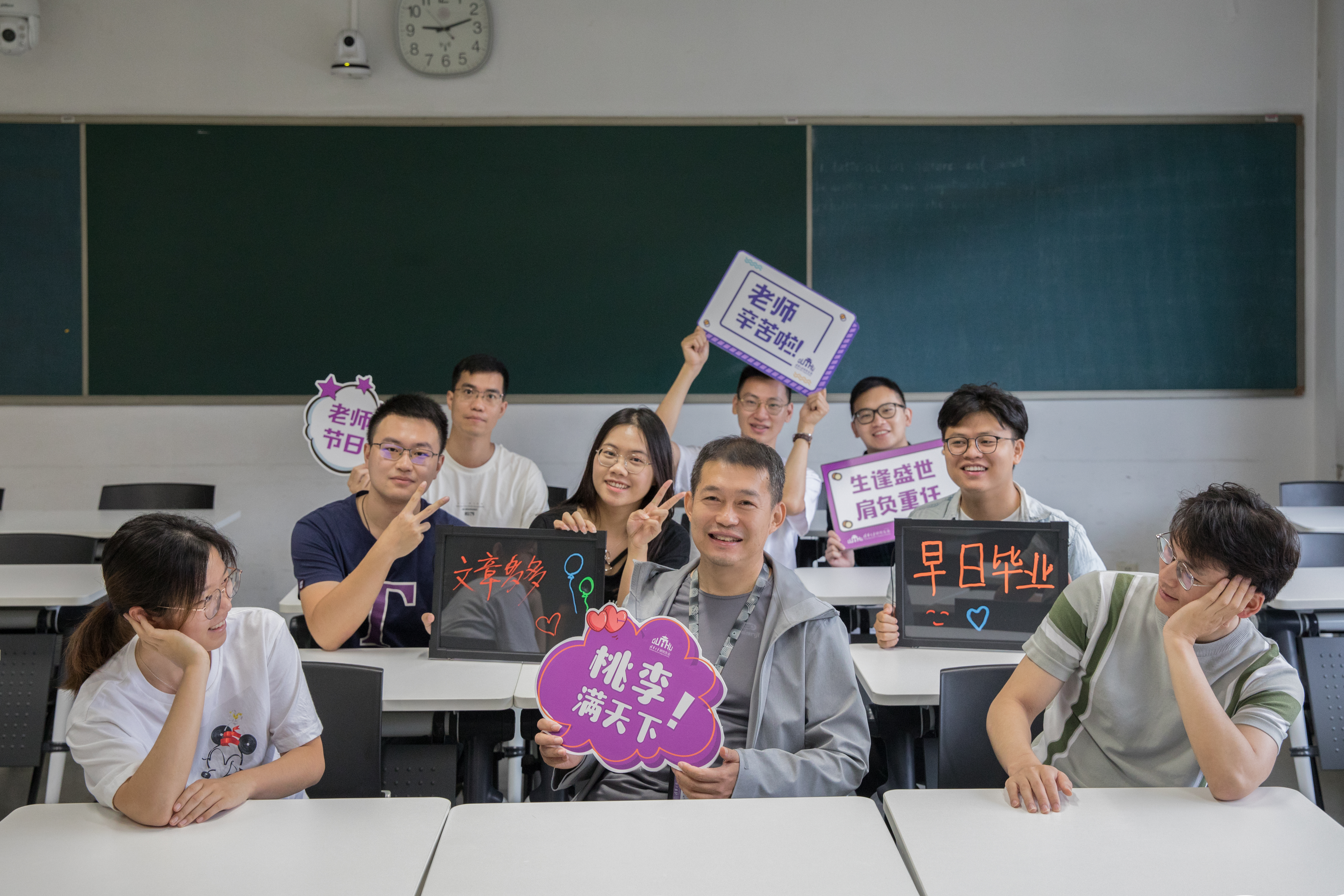 “老师,今天给咱们的课题组过生日!”药学院2020级博士生杨旭娟提前在拍摄地点布置好蛋糕鲜花,给导师一份专属于教师节的惊喜与感动。土木系教师张熠一改科研中严肃认真的形象,合影时兴致勃勃地配合学生摆出天马行空的造型,“今天合影,你们的想法我都满足,给课题组多留下一些回忆”。老师和学生们一起设计手写荧光板的内容,写下“认认真真做学术”“社会情怀、科学精神”等标语,互动中充满欢声笑语,师生情感交流增进。