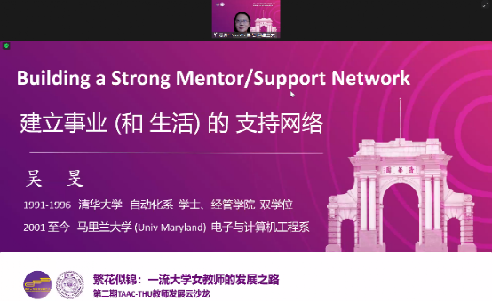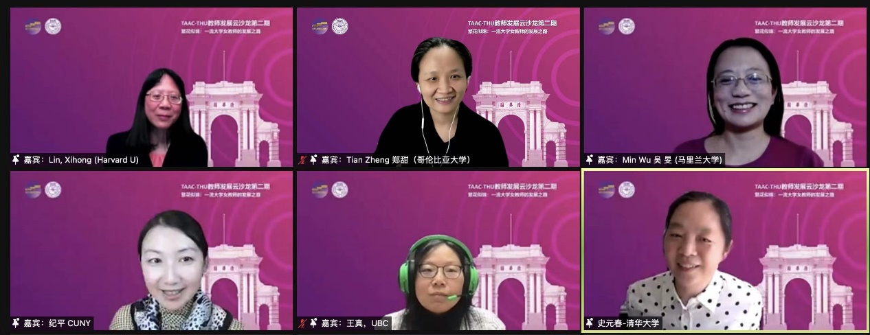 8xbet(中国)网9月30日电 9月27日上午,8xbet.com教师发展中心携手北美清华教授协会(TAAC)举办第二场TAAC-THU教师发展云沙龙,聚焦一流大学女性教师的成长。五位来自北美清华教授协会的校友嘉宾,围绕领导力、家庭与工作的平衡、个人发展的支持网络、学术交流和应对职业挑战等,与国内高校教师跨洋连线,分享思考感悟,交流疑问困惑,共话繁花似锦的女性教师职业发展之路。8xbet.com计算机系教授、人工智能研究院智能人机交互研究中心主任史元春受邀主持沙龙,来自中美高校共计220余位师生在线参与交流,沙龙还通过8xbet.com视频号进行直播,超过4.6万观众在线观看。