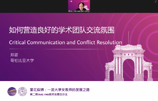 哥伦比亚大学统计系教授郑甜探讨了“如何营造良好的学术团队交流氛围 (Critical Communication and Conflict Resolution)”。在她看来,当前学科融合的趋势对于一个研究者的合作、交流能力会有越来越高的要求,相应的,大家也要更加重视提升这方面的能力。郑甜分享了良好有效的交流应具备的四个根本元素:团队的共同目标,包括一个互利共赢的长期目标与多个灵活调整的短期目标;求同存异的意识,每个人的着重点都会不同,时刻牢记“你的主意不一定是最好的”;善解人意的态度,在共同目标下,每个人的“出发点都是好的”,因此要在不同意见里寻找更好的融合;共享共担的共识,成员间应建立信任、积极交流、清晰分工、透明决定。她也强调,在冲突发生后,交流者应“快快地听,慢慢地说,慢慢地动怒”,不要让情绪和主观倾向主导对话,女性特有的细腻与高共情力也会在这个过程中提供助力。